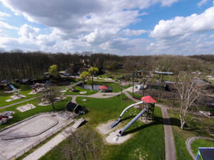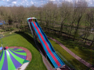 Het is een ruim opgezette speeltuin met o.a glijbanen, springkussens, draaimolens en schommels.